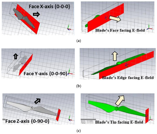 Figure 2 illustrates the blade orientations towards the E-field direction. The blade orientation was defined by their positions in XYZ coordinates. For this case, a linear polarization plane wave with plane normal (x = −1, y = 0, z = 0) and electrical field vector (x = 0, y = −1, z = 0) was used to transform the blade orientation. The blade was positioned along the x-axis for the E-field to be in the direction of the “blade-face”, as in Figure 2a.