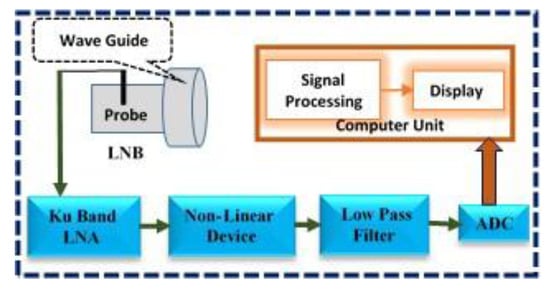 The FSR receiver circuit is considered simple and comprises of a customized low noise block (LNB) installed attached to the dish antenna. The feed horn is located at the dish’s focal point to receive the focused reflected energy by the dish. The down conversion process begins from the output of the waveguide probe passing through a Ku-band pass filter to remove the unwanted frequencies. Due to the low power signal received, an LNA was made to amplify the signal power to meet the sensitivity level of the amplitude detector and then passes through a low-pass filter. The LPF output is converted to digital form by an analogue to digital converter (ADC) and saved for signal processing. The block diagram of the DVB-S p-FSR receiver is illustrated in Figure 5.