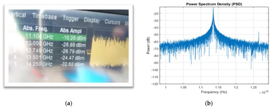 The signal under consideration had an approximate calculated power received of −110 dBm. This signal power was considered low, but sufficient to be utilized by the FSR system; nevertheless, the system further amplified the signal before the non-linear device process. An LNA with a 20-dB gain and a noise figure of 2 dB, with an output capability of up to +25 dBm, was used within Ku-band frequencies. The LNA improved the signal power to the required level for a successful down-conversion process and ensured that the signal power was higher than the diode sensitivity level.