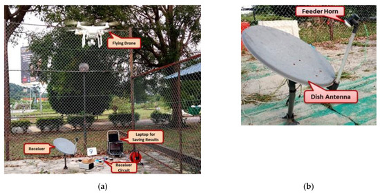 Figure 7 shows the experimental setup of the receiver including the parabolic dish antenna. A parabolic dish antenna was placed to point towards the satellite direction and was located at the end of the futsal court to enable the drone to have enough flying space. Our best efforts were made to decide the baseline between the satellite and the parabolic dish antenna, despite the transmission nature of the DVB-S signal which is circularly polarized. The receiving system parameters are depicted in Table 6. A commercial quadcopter drone was used during the experiment as a target of interest.