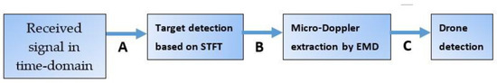 For a target with constant speed, it is assumed that the resultant Doppler frequency shift will also be constant [35]. In reality, a target like a drone does not maintain constant velocity while moving, and neither does the rotating blade. This makes the micro-Doppler analysis become challenging due to the non-linear and non-stationary characteristics of the signal. This non-linear and non-stationary signal make other signal processing techniques like STFT (which assumed linearity and stationary nature) non-optimal; hence, making the empirical mode decomposition (EMD) a good candidate for this analysis of the time-varying Doppler frequency shift. An advantage of EMD was that it does not require pre-defined kernel functions or prior knowledge of the signal behavior.