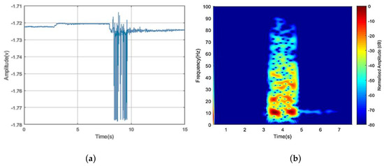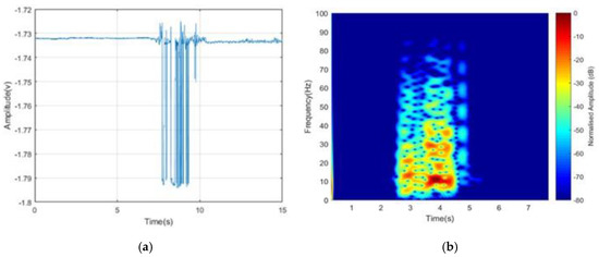 (a) Received signal (Signal 2) in time domain at the output of ADC, and (b) its joint time–frequency representation of the sampled signal (6–14 s) denoted as target signature.