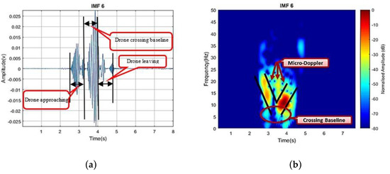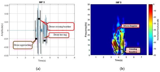 - IMF6–IMF8 follow suit, despite the low-frequency components, yet it maintained the signal behavior. The observed signature corresponds to the main Doppler component generated by the target/drone body. Although the main Doppler components can still be surrounded by the micro-Doppler spikes, IMF6 provides a clear signature of the target crossing baseline—this will further be analyzed in the subsequent section;
