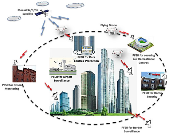Although the DVB-S-based FSR system is limited to the narrow coverage area, it can easily be integrated into a conventional passive bistatic DVB-S system and enjoys the benefit of FSR. FSR will leverage its high Doppler resolution for target recognition. This study may open a basis for comprehensive aerial monitoring that could be utilized in, but not limited to, applications such as air traffic surveillance, border monitoring and perimeter protection. Figure 17 illustrates some potential applications of the DVB-S FSR system, with the possibility of integrating with passive bistatic radar, among which may include air traffic surveillance and control.