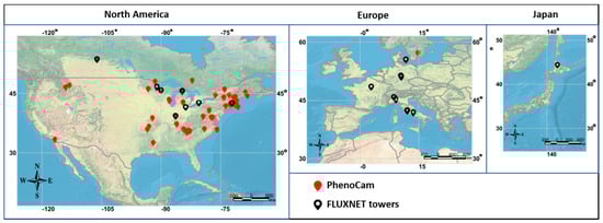 The study was conducted over the North Hemisphere in pixels classified as deciduous forests or mixed vegetation according to the annual C3S Global Land Cover for the year 2018 [51]. The validation was done over PhenoCam sites distributed across North America and one in Europe, and FLUXNET towers sites both in North America and Europe and one in Japan. We selected only deciduous forests sites with at least 2 years of available observations. This resulted in 64 sites from PhenoCam, and 16 towers of FLUXNET covering a broad range of latitudes (30–60°N) and elevations (1-1870 m a.s.l.) (Figure 1 and Table S1).