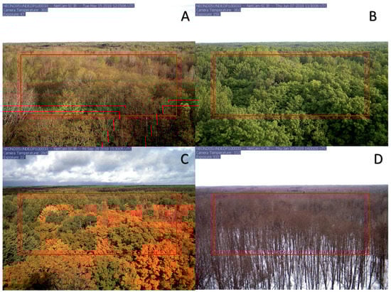 PhenoCam images captured in (A) spring, (B) summer, (C) autumn and (D) winter over the NEON.D05.UNDE.DP1.00033 site (46.23°N, 89.54°W). The red rectangle indicates the borders of the selected region of interest.