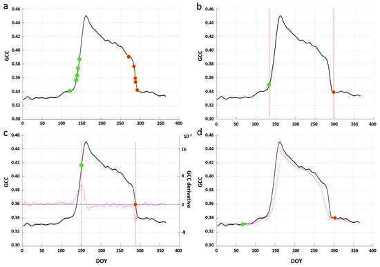 The study of vegetation phenology and its patterns on a global scale have become more important since the late twentieth century for analyzing the effects of climate change [1,2]. Remote sensing is a useful tool for characterizing land surface phenology (LSP) [3] and global changes of vegetation [4,5,6]. De Beurs et al. [7] analyzed a broad range of statistical methods designed to extract phenological metrics from satellite time series based on threshold percentiles [8,9,10], moving averages [11], first derivatives [12,13], smoothing functions [14] and fitted models [15].