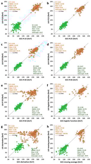 Scatterplots for SoS (in green) and EoS (in orange) estimated from CGLS LAI V2 and PhenoCam GCC time series by the threshold (10th (a), 25th (b), 30th (c), 40th (d) and 50th (e) percentiles of LAI amplitude), logistic-function (f), derivative (g) and moving-average (h) methods. Statistics of the comparison are presented in Table 2.