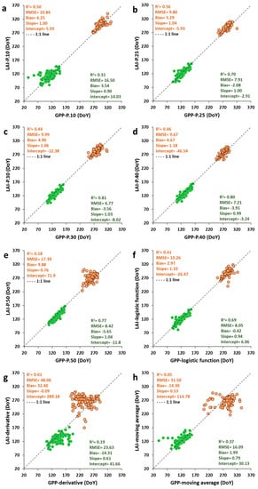 Scatterplots for SoS (in green) and EoS (in orange) estimated from CGLS LAI V2 and FLUXNET GPP time series by the threshold (10th (a), 25th (b), 30th (c), 40th (d) and 50th (e) percentiles of LAI amplitude, logistic-function (f), derivative (g) and moving-average (h) methods. Statistics of the comparison are presented in Table 2.