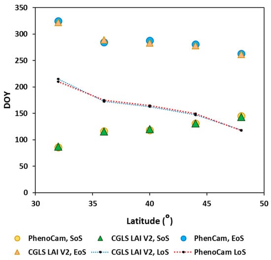 Latitudinal gradients of average phenological metrics for the start (SoS), end (EoS) and length of season (LoS) extracted from CGLS LAI V2 and PhenoCam GCC time series over the PhenoCam deciduous sites in North America (Figure 1). Data was aggregated in five groups of latitude, taking into account the number of sites: 30–34°N, 34–38°N, 38–42°N, 42–46°N and 46–53°N.