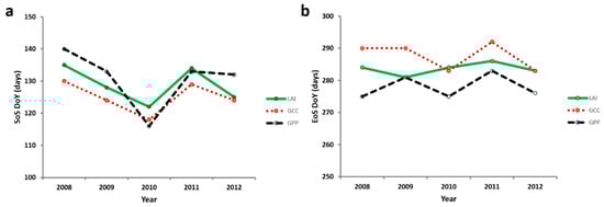 Interannual variation of the (a) start of the growing season (SoS), and (b) end of season (EoS) estimated from the CGLS LAI V2, PhenoCam GCC and FLUXNET GPP with the threshold method (percentile 30 for the timing of SoS, and percentile 40 for the timing of EoS) over the Harvard Forest (Latitude 42.54°, Longitude –72.17°).