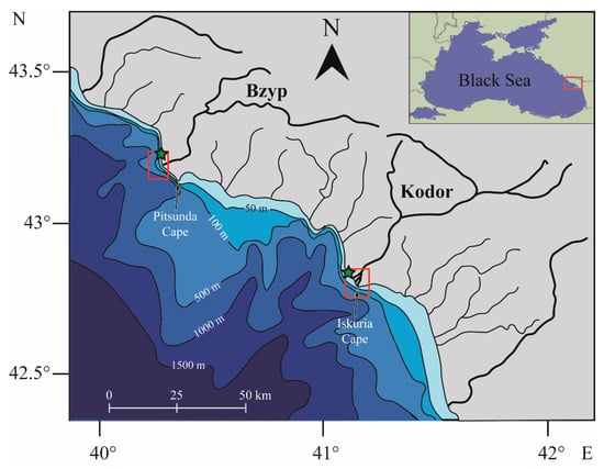 The continental shelf at the study area is very steep and narrow. The distance between the coastline and the 500 m isobath is less than 10 km near the Kodor and Bzyp mouths (Figure 1). The main coastline features at the study area are large capes, namely the Iskuria and Pitsunda capes, located to the south from the Kodor and Bzyp deltas, respectively (Figure 1). The local sea circulation from surface to the depth of 200–250 m is governed by alongshore currents due to the current system cyclonically circulating along the continental slope, which is generally referred to as the Black Sea Rim Current [66,67]. Sea surface circulation in the study region is also influenced by nearshore anticyclonic eddies, which are regularly formed between the main flow of the Rim Current and the coast owing to baroclinic instability caused by wind forcing and coastal topography [68,69,70]. Tidal circulation at the study area is very low and tidal amplitudes are less than 6 cm [71,72]. Salinity in the coastal sea, which is not influenced by river discharge, is 17–18 [67,73].