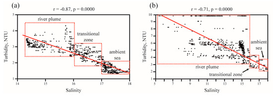 Relations between salinity and turbidity (a) within the Kodor plume and the adjacent saline sea on 2–3 April 2019 and (b) within the Bzyp plume and the adjacent saline sea on 31 May 2019. Dashed red boxes indicate river plumes, transitional zones, and ambient saline sea. Red lines indicate regression lines. The Pearson correlations coefficients (r) with p-values, which indicate statistical significance of the observed relations, are given above the diagrams.