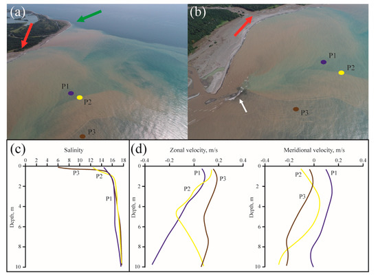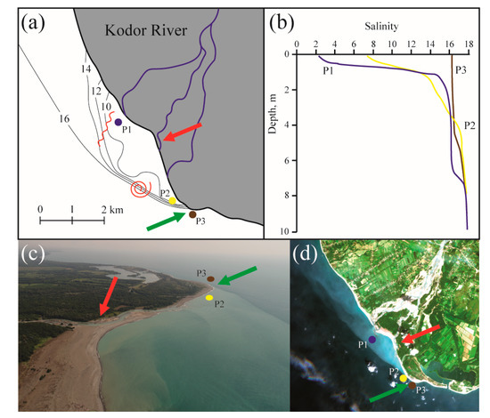 (a,b) aerial images, (c) vertical salinity, and (d) velocity profiles at the frontal zone of the Kodor plume formed behind the shoal on 1 September 2018. Colored dots indicate locations of vertical salinity and velocity measurements (P1, blue—the low-turbid zone of the plume; P2, yellow—the frontal zone; and P3, brown—the turbid part of the plume). The white arrow in panel (b) indicates location of the shoal, red arrows indicate location of the central deltaic branch of the Kodor River, and the green arrow indicates location of the Iskuria Cape.