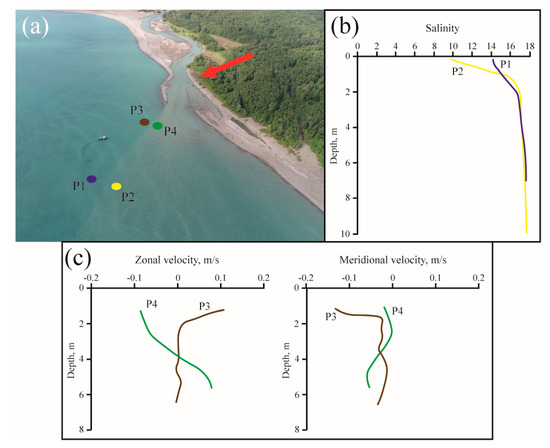 (a) aerial image, (b) vertical salinity, and (c) velocity profiles at the frontal zone between river plumes formed by the northern and central deltaic branches of the Kodor River on 1 September, 2018. Colored dots indicate locations of vertical salinity (P1, blue—the northern plume; P2, yellow—the central plume) and velocity (P3, brown—the northern plume; P4, green—the central plume) measurements. The red arrow in panel (a) indicates location of the central deltaic branch of the Kodor River.