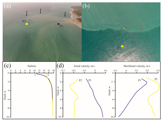 (a,b) aerial images, (c) vertical salinity, and (d) velocity profiles at the frontal zone between the emergent and the residual parts of the Kodor plume on 2 September 2018. Colored dots indicate locations of vertical salinity and velocity measurements (P1, blue—the emergent plume; P2, yellow—the residual plume). Arrows in panels (a) and (b) indicate distinct frontal zones between the emergent and the residual parts of the Kodor plume. Red arrows in panels (a) and (b) point at the same segment of the frontal zone where in situ measurements were performed.