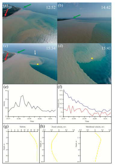 Aerial images of the southern part of the Kodor plume (a,b) before and (c) during interaction between the plume and the eddy acquired at (a) 12:52, (b) 14:42, (c) 15:34, and (d) 15:41 on 1 September, 2018. (e) surface salinity, (f) zonal (blue) and meridional (red) velocities measured during 15:57—16:01 and (g) vertical salinity and (h) velocity profiles measured at 16:02 within the eddy. Yellow dots in panels (c) and (d) indicate location of salinity and velocity measurements. The white arrow in panel (c) indicates location of the eddy, red arrows indicate location of the central deltaic branch of the Kodor River, and green arrows indicate location of the Iskuria Cape.