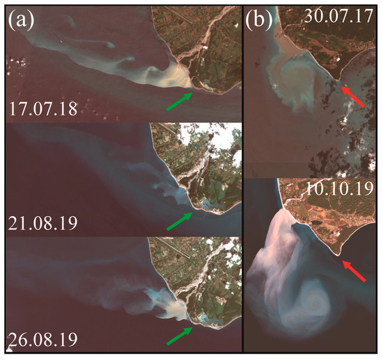 Sentinel-2 ocean color composites (a) from 17 July 2018, 21 August 2019, and 26 August 2019 illustrating interactions between eddies and the Kodor plume and (b) from 30 July 2017 and 10 October 2019 illustrating interactions between eddies and the Bzyp plume. Green arrows indicate location of the Iskuria Cape and red arrows indicate location of the Pitsunda Cape. Note that images at panels (a) and (b) are inconsistent, i.e., they show river plumes at different dates.