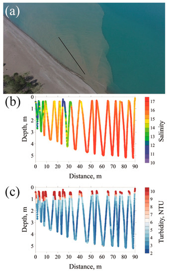 Aerial observations of internal waves in the Bzyp plume described above were supported by in situ salinity and turbidity measurements performed from a flat-bottomed boat with shallow draft to minimize the boat-induced mixing of sea surface layer (Figure 11). Measurements included 15 surface-to-bottom profiles continuously performed from a free-drifting boat starting at the generation area of the internal waves at the distance of 10 m from the river mouth and finishing 90 m far from the starting point (Figure 11a). The obtained data revealed large difference in vertical salinity structure of the Bzyp plume inside and outside this generation area of internal waves. The first half of the hydrological transect was located at the area of formation of the hydraulic jump as a result of abrupt deceleration of the inflowing river jet (Figure 11b). Similarly to the hydraulic jump observed and described by Osadchiev [33] at the inflowing jet of the Mzymta River, we registered anomalously deep penetration of low-saline water at the generation area of the internal waves in the Bzyp plume. Low-saline water (10–14) was observed from surface to the depth of 3–4 m along 0–5 m and 25–35 m of the transect. Vertical salinity structure within this part of the plume was unstable with multiple overturns (reverse salinity difference was up to 1 at vertical distance of 0.1 m) and large salinity gradients. Vertical salinity structure of the Bzyp plume between the areas of the hydraulic jumps, i.e., along the 5–25 m of the transect, showed relatively homogenous salinity (14.5–16) from surface to bottom, albeit it was much higher than within the areas of hydraulic jumps.