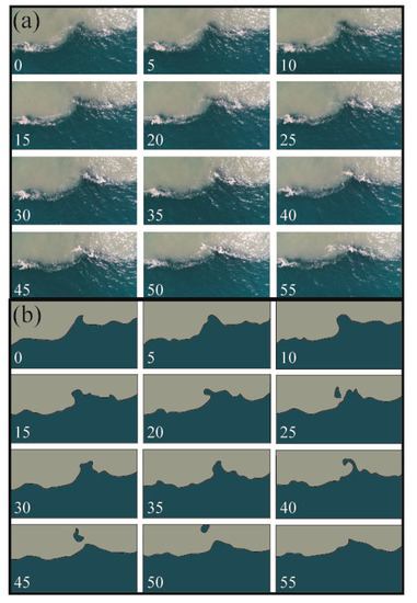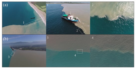 Aerial remote sensing of the Kodor and Bzyp plumes showed undulate structure of long segments of their outer borders manifested by alternation of specific convex and concave segments. These segments are 2–10 m long and up to 2 m wide and hereafter are referred as “lobes” and “clefts” [52,53]. Aerial images of the undulate fronts observed at the Kodor plume border on 1 September, 2018 and at the Bzyp plume border on 1 June 2019 are shown in Figure 12. This lobe-cleft structure was registered only at sharp and narrow frontal zones formed between the emerging plume, on the one hand, and the residual plume or the ambient sea, on the other hand. Lobes and clefts were absent at diffuse fronts, i.e., wide and low-gradient fronts that contour the outer parts of the plumes, which experience intense mixing with the ambient sea. In particular, these undulate fronts commonly extended from the river mouths and bounded the inflowing river jets, i.e., near-field parts of the plumes. These fronts were not observed in the far-field parts of the plumes and in the coastal surf zone during periods of active wave breaking due to intense mixing (Figure 12).
