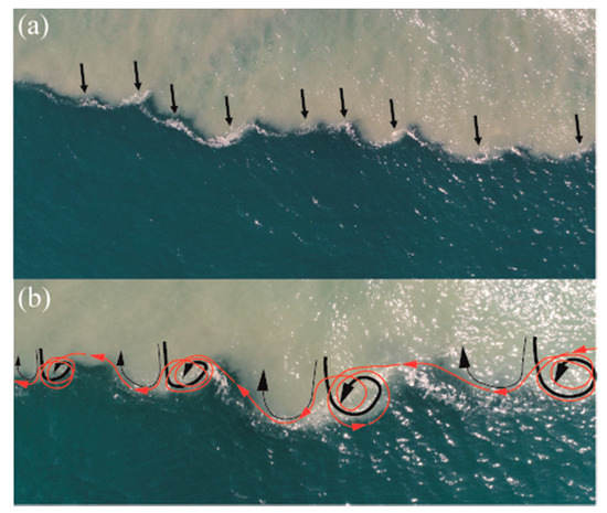 (a) aerial image of the undulate border of the Kodor plume on 1 September 2018 and (b) the scheme of the reconstructed circulation within the lobes (black lines) and the transport of foam and floating litter along the plume border (red lines) (b). Black arrows in panel (a) indicate foam accumulated within cyclonic vortexes in the right parts of the lobes.