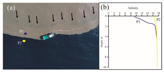 (a) aerial image and (b) vertical salinity profiles at the undulate border of the Kodor plume on 1 September 2018. Colored dots indicate locations of vertical salinity measurements (P1, blue—the plume; P2, yellow—the ambient saline sea). Black arrows in panel (a) indicate a stripe of low-turbid water within the Kodor plume stretched along its border.