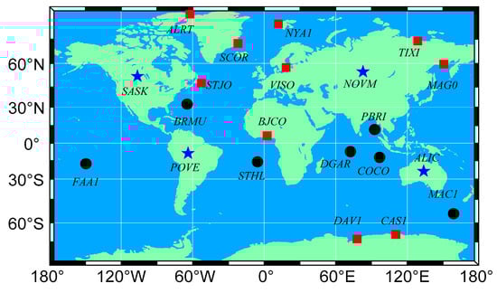 The distribution of the global navigation satellite system (GNSS) stations: four inland sites (blue star), seven island sites (black points), and ten coastal sites (red squares).