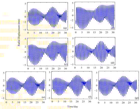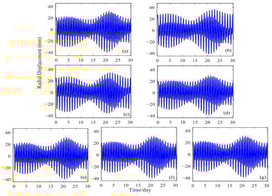 Figure 3, Figure 4 and Figure 5 show the time series of the vertical displacements caused by the OTL effects at three GNSS sites from 1 January 2019 to 31 January 2019. The NOVM station in Figure 3 is an inland station located in Novosibirsk, Russia; the BRMU station in Figure 4 is an island station located on Bermuda island, United Kingdom; and the NYA1 is a coastal station located on Svalbard, Norway. As shown in Figure 3, Figure 4 and Figure 5, it can be seen that the magnitudes of the OTL effects are much greater at the coastal and island stations than they are at the inland stations. The variation of the vertical displacements due to the OTL effect at the inland NOVM station is between −4 and 4 mm, while at the BRMU station it is mostly from −30 to 30 mm, with the largest displacement of −40.61 mm. At the coastal station NYA1, the vertical displacement was approximately between −15 and 15 mm, with the largest displacement of −17.71 mm.