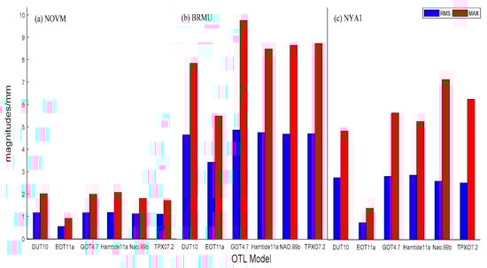 The root-mean-square (RMS) value and maximum value of the differences between the vertical OTL displacement from the FES2004 model (as reference) and other OTL models at the (a) NOVM station, (b) BRMU station, and (c) NYA1 station.