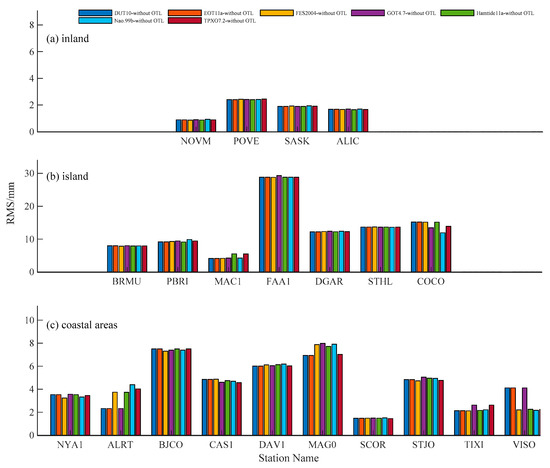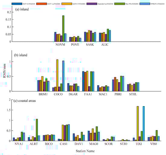 The RMS error of differences between ZTDs calculated using the FES2004 ocean tide model (as reference) and the other OTL models at (a) inland, (b) island and (c) coastal areas.