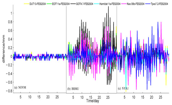 The difference of the ZTD calculated with the FES2004 model (as reference) and other OTL models at the (a) BRMU station, (b) NYA1 station, and (c) NOVM station.