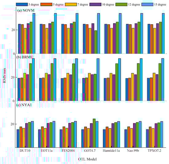 The RMS differences between the GNSS-derived ZTD and radiosonde stations with six cut-off angles and different OTL models at the (a) NOVM station, (b) BRMU station, and (c) NYA1 station.