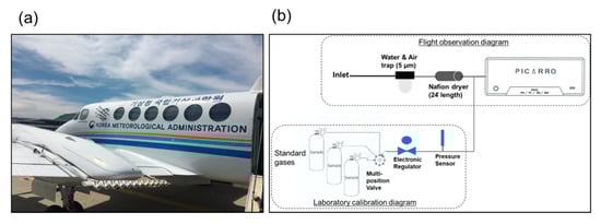 We used a KMA research aircraft based on the Beechcraft (Wichita, AR, USA) King Air 350 (Figure 1a) modified by Weather Modification Incorporated (Fargo, ND, USA). It has a ceiling of 9.6 km, speed range of 70–120 m/s, with a maximum flight time of 5.5 hours with the maximum payload. There are five seats: two for pilots, one for a scientist to manage the science missions, and two for the instrument operators. There are 24 instrumentations and one air inlet installed in the aircraft as shown in Table S1 of the supplementary materials (the payload of the King Air 350). The aircraft carries a Global Positioning System (GPS) that provides altitude and position information. Additionally, the Aircraft Integrated Meteorological Measuring System-20 was used to obtain basic meteorological data such as wind speed, wind direction, barometric pressure, vertical velocity, and so on.
