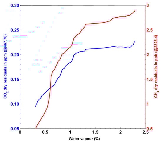 The residuals of CO2 and CH4 corrected by Picarro-provided water correction parameter corresponding to NOAA standard gas at a mole fraction of 467.78 ppm for CO2 and 2325.4 ppb for CH4 with gradually increasing water vapor from 0.3 to 2.3%.