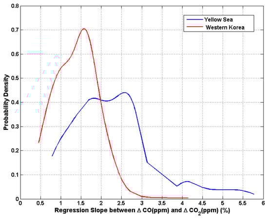 The distributions of the regression slopes between ∆CO and ∆CO2 (R2 > 0.4 only) for the 14 science flights by analysis regions in the climate change monitoring (CM) mission (red) and the environmental monitoring (EM) mission (blue) (Figure 3). Both lines are normalized to a probability density. Regression slopes were calculated using the Williamson–York linear least-squares fitting method, considering measurement uncertainties of CO and CO2, as shown in Table 1. The expanded uncertainties of NOAA standard sample gases also were considered.