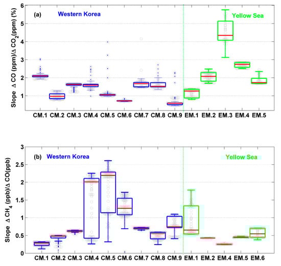 One-minute regression slope (correlation coefficient R2 > 0.4) (a) between CO and CO2; (b) between CH4 and CO grouped by analysis regions, showing observations from the climate change monitoring (CM) mission (blue) that covered Western Korea inland and the environmental monitoring (EM) mission (green) that covered the Yellow Sea (Figure 3) (all the aircraft sample times denoted by CM.1 through CM.9 and EM.1 through EM.6 are provided in Table 2). Gray open circles show the spread distributions of effectively correlated regression slopes between CO and CO2 and between CH4 and CO. Each box and whisker plot shows the 25th, 50th, and 75th percentiles, and all other observations are indicated with outlier points.