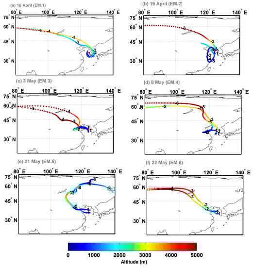 Six-day HYSPLIT backward trajectories demonstrated the air mass arriving at receptor (marked by red star), located at the altitude of 600 m above mean sea level (amsl), stem from the northwestern region and Eastern China through the transport regimes of 2500–5000 m and below 1000 m amsl, respectively, during six one-day flights of EM missions (a–f). The numbers mark the position and backward time (days) of the particles before arrival at the receptor and the transport altitude is coded by color.