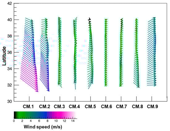 ECMWF ERA5-derived wind vectors at 900 hPa averaged in longitude (126.5–127°E) covered the inland Western Korean versus the campaign flight time (0300–0700 UTC) during climate change monitoring (CM) missions (all the aircraft sample times denoted by CM.1 through CM.9 are provided in Table 2). The direction of the arrows indicate wind directions and wind speed is coded in color.