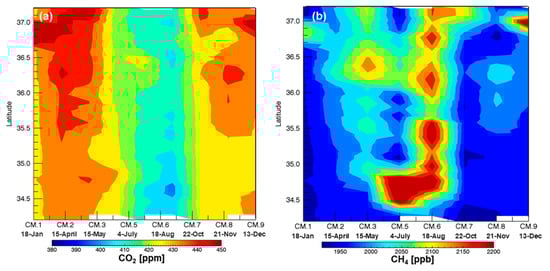 Spatiotemporal distributions of (a) CO2 and (b) CH4 for all climate change monitoring (CM) missions covered Western Korea for 2019. The figure depicts CO2 and CH4 measured within the boundary layer, which are averaged at latitude bins of 0.075° (approximately 5-km spatial resolutions) and temporally interpolated with aircraft sampled time (all the aircraft sample times denoted by CM.1 through CM.9 are provided in Table 2). Note that CM.4 mission’s data are not included because the aircraft sampled above the boundary layer height.