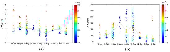 Distributions of differences (denoted by ∆) between 1-min average (a) CO2 and (b) CH4 in the boundary layer and background, which were their mean levels measured in the free troposphere (2–8 km). The ∆CO2 and ∆CH4 are colored by latitude for each climate change monitoring (CM) scientific flight that covered inland Western Korean. The gray diamond and line show the mean levels of observations from each flight.