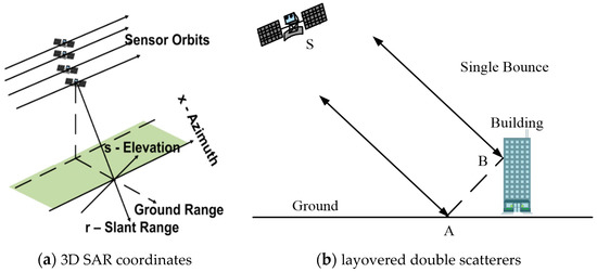 3D SAR coordinate system (a) and typical layover effect of double single-bounce scatterers in urban SAR images (b).