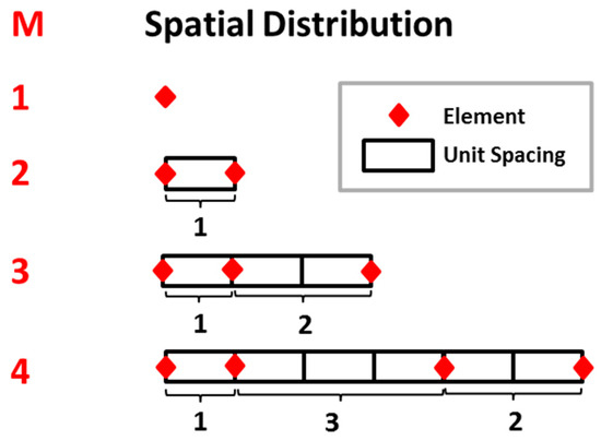 According to literatures [37,47], when the number of elements is less than 5, zero-redundancy arrays exist. In other words, there are only four zero-redundancy arrays, which have been elegantly proved in literature [52]. The four zero-redundancy arrays and their spatial distributions are shown in Figure 2. Except for the zero spacing (spatial distance) in the trivial case of single-element array, each spacing is presented only once. For example, spacing between adjacent elements are 1, 3, and 2, respectively, for the 4-element array, leading to a maximum spatial distance of 6. In other words, there is one, and only one, pair of elements separated by each multiple of the unit spacing in zero-redundancy arrays, resulting in a maximum spacing equal to the distance between the left-end and right-end elements. As shown by Figure 2, the 3-element and 4-element arrays are the only two non-uniformly distributed arrays with zero-redundancy.