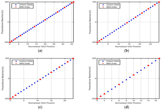 We designed four groups of uniform orbits with perpendicular baseline aperture of 1000 m in the simulation. The numbers of uniform orbits are 37, 30, 24, and 18, respectively. The baseline distributions of the four groups are shown in Figure 3, where the blue dots represent uniform orbits. Their corresponding MRA orbits are also selected following Table 1, as marked with red triangles in Figure 3. Compared to the uniform orbits, the numbers of MRA orbits are dramatically reduced.