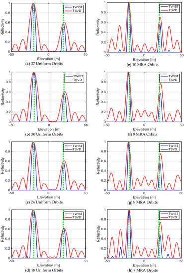 If the uniform orbits are replaced by their corresponding MRA orbits, TSVD suffers from dramatic increase of sidelobes, with normalized reflectivity of approximately 0.6 for the largest sidelobe, as shown in Figure 4e–h. The strong sidelobes in TSVD profiles may lead to false detection of a third scatterer. On the other hand, TWIST shows a much better resistance against sidelobes, with the largest sidelobe smaller than 0.23, see Figure 4h. By comparing the four figures in Figure 4e–h, we can tell that the normalized strengths of sidelobes in neither TSVD nor TWIST profiles are further increased when the number of MRA orbits drops from 10 to 7. This means that reducing the number of MRA orbits would also not result in a dramatic increase of sidelobes, as long as MRA orbits are used.