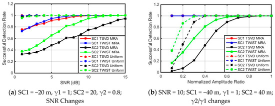 Successful detection rate of 1000 simulated double-scatterer pixels at different SNR levels (a) and normalized amplitude ratios (γ2/γ1) (b), where SC abbreviates from scatterer and γ is the normalized reflectivity (amplitude).