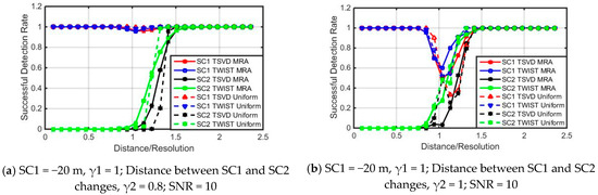 Successful detection rates of double scatterers when distance between both scatterers changes, where SC abbreviates from scatterer, γ is the normalized reflectivity (amplitude).