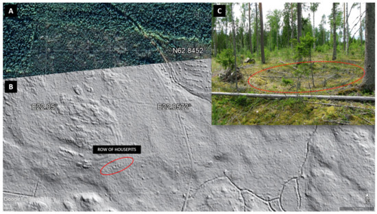 Stone Age housepit features are difficult to find and register via traditional fieldwalking survey in forested environments. They are often detectable in LiDAR generated digital terrain models (DTM) when they occur in clusters of several housepits. (A) An aerial photo of thick coniferous forest canopy at Laihia, W Finland; (B) 18 housepits and associated pit features in row formation in a LiDAR generated DTM at the Tuoressaari 1 site in Laihia. These features were validated via test pitting and surface find collection; (C) an individual housepit is difficult to discern on terrain. Background data provided by Google Earth and the National Land Survey of Finland. Illustration and photo by Satu Koivisto/SKAIK project, Finnish Heritage Agency.