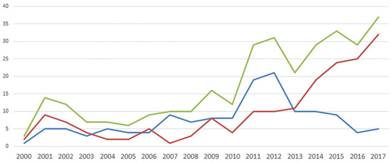 Research (in blue) versus management (in red) initiated archaeo-geophysical surveys in Norway. The total number of surveys is shown in green. Graphic by Arne Anderson Stamnes.
