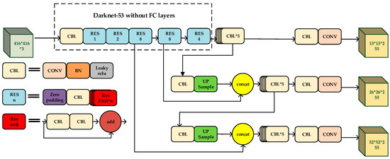 The final outputs of YOLO-V3 are three scales: 13 × 13, 26 × 26, and 52 × 52, which are responsible for the detection of big targets, medium-sized targets, and small targets, respectively.