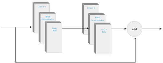 In order to alleviate the problem of gradient fading on the premise of deepening the network, the feature extractor of YOLO-V3 employs the structure of ResNet. The Darknet53 of YOLO-V3 contains five residual blocks. Each residual block consists of one or a set of multiple residual units. The structure of the residual unit is exhibited in Figure 2.